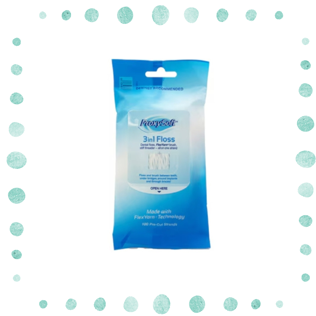 プロキシソフト 3in1 フロスは、スレッダー・スポンジ状フィラメント・フロスの3つの機能を1本に備えた歯間清掃用フロスです。特殊加工されたナイロン繊維がプラークをしっかり絡め取り、伸縮性のある構造で歯間やブリッジ下、矯正装置の周りにもスムーズに挿入できます。歯ブラシでは届きにくい部分まで効率よく清掃できるため、日常のセルフケアから専門的な口腔ケアまで幅広く活用されています。