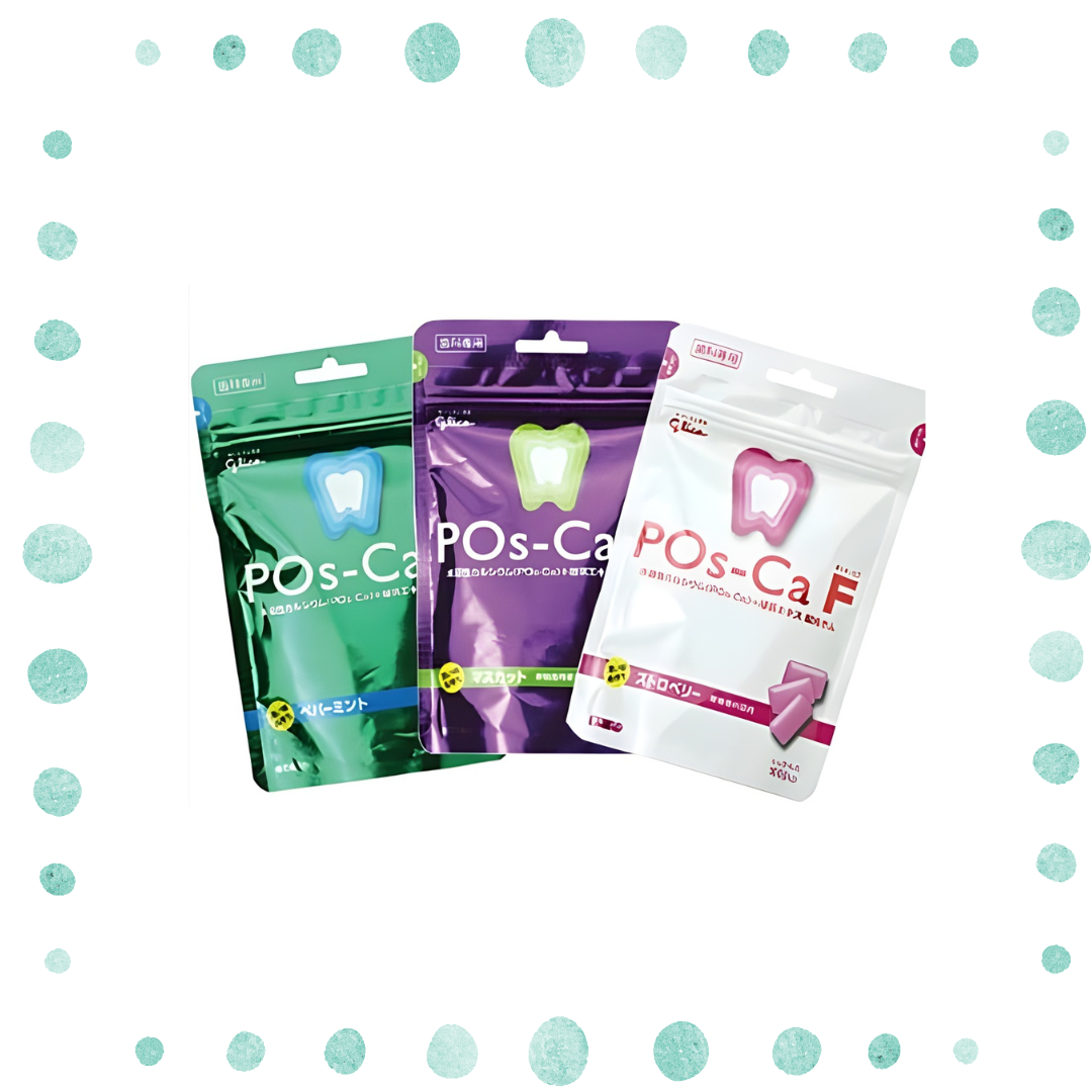 ポスカF(POs-Ca F)は、江崎グリコが開発した歯科専用ガムで、むし歯予防と口腔環境の改善を目的としたオーラルケア製品です。噛むことで唾液分泌を促進し、カルシウムとフッ素(フッ化物)イオンがお口に広がり、歯の再石灰化をサポートします。日常のケアに取り入れやすく、食後や間食後の習慣として、子どもから大人まで幅広く活用されています。